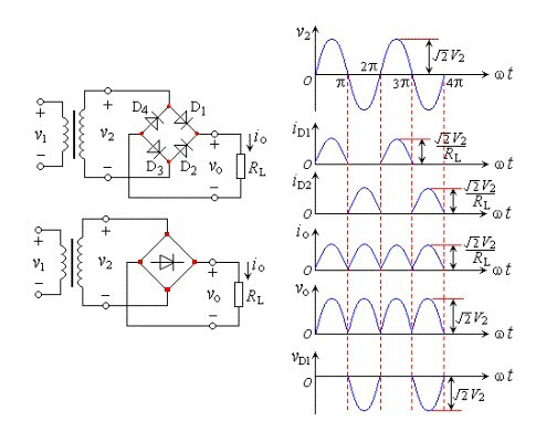 全波整流電路:利用副邊有中心抽頭的變壓器和兩個二極管構(gòu)成如下圖所示的全波整流電路,從圖中可見,正負(fù)半周都有電流流過負(fù)載,提高了整流效率。